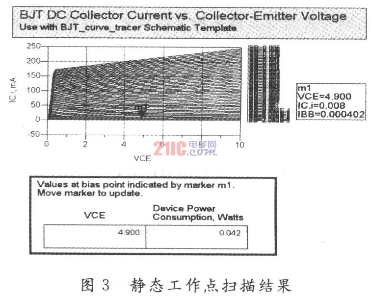 根据BFP450的datasheet得知最大基极电流IBB=10 mA,最大集电结电压为VCE=15 V,所以扫描范围为:IBB=20~100μA,步进为10μA。VCE=0~10 V,步进为O.1 V。将BFP450的Spice模型导入ADS中,得到静态工作点扫描结果,如图3所示。