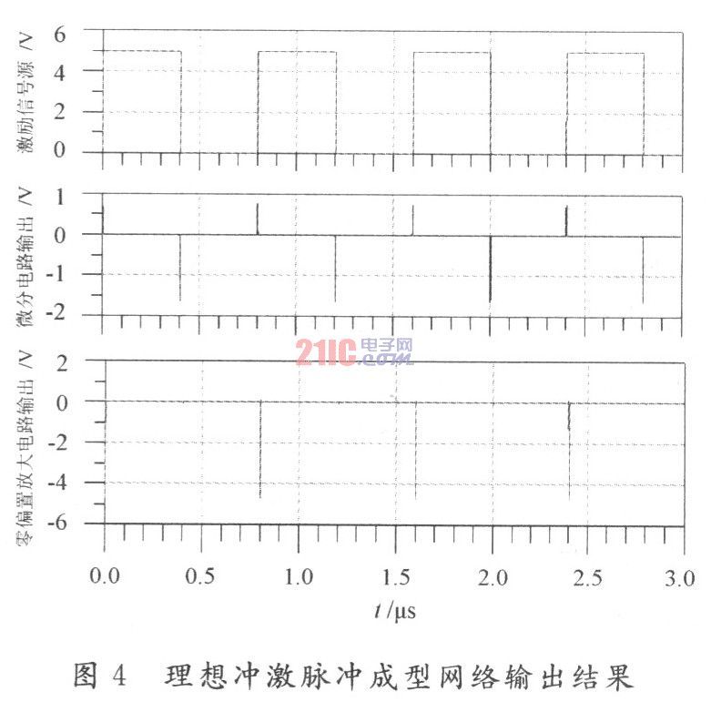 推导出R2=1 kΩ,R4=1 kΩ。再将阻值带回偏置电路中,得到静态工作点为IBB=14.96 μA,Ic=23.77μA,VBE=534.1 mV,VCE=4.976 V。理想冲激脉冲成型网络的各级输出如图4所示。