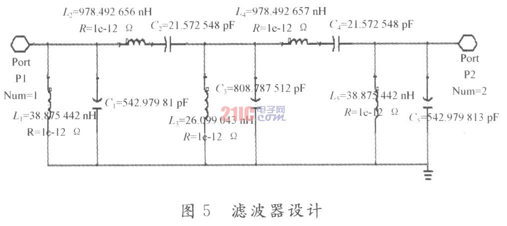 从输出结果来看,基本达到了预期结果,提取出了正向微分信号,并倒相放大到5 V,拖尾振荡很小。设计方案中最为重要的就是脉冲成型网络,它决定了输出脉冲的频带范围,时域形状好坏等。所以利用ADS2006A中的SmartComponentchart进行辅助设计。设计指标为:滤波器类型为5阶切比雪夫滤波器,通带平坦度为0.5 dB,范围:30~40 MHz。阻带衰减为50 dB,范围为10 MHz,50 MHz。输入、输出阻抗均为50Ω。如图5所示。
