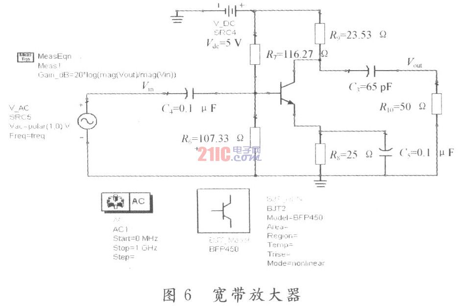 在设计零偏置放大电路时,已经确定了BFP450的静态工作点,在这级宽带放大电路中引入负反馈来稳定静态工作点。因为是带通信号,所以采用阻容耦合方式连接电路。具体电路如图6所示。