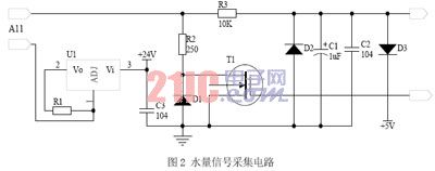 水量信号采集电路如图2 所示,该电路可以采集工业现场的电压信号(1V-5V)和电流
