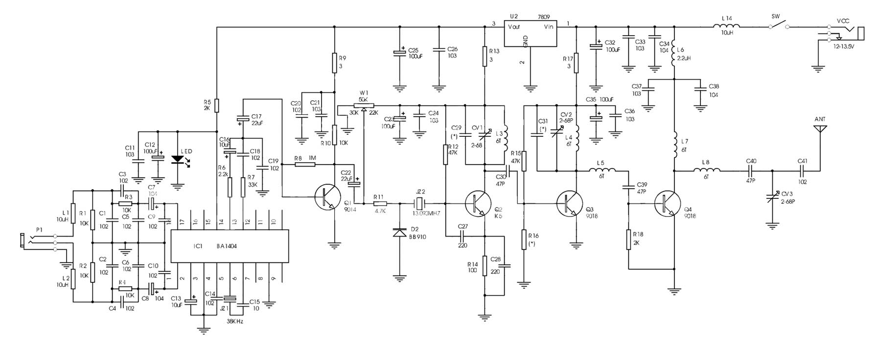 下图为该机的工作原理图,该电路主要由四部份组成:供电电路,立体声编码电路,晶体振荡电路和射频放大电路;U2和发光二极管LED及相关阻容元件构成供电电路,其中U2输出稳定的9V电压,供BA1404和Q1Q2之用,发光二极管在这里除做为电源指示外,还为BA1404提供稳定的2V左右的工作电压。R5为LED的限流电阻。C25,C26,C32,C33,C34为电源滤波电容,R5,R13,R17为电源退耦电阻,可减少各级间因使用同一电源而带来的级间干扰。BA1404及周边元件构成调频立体声编码电路,这里不使用其内部的高频振荡电路,只将它作为立体声编码器之用。R1,R2,R3,R4和C1-C10构成调频预加重及输入匹配网络,与接收机的去加重网配合可有效地改善频响效果。L,R两路音频信号经预加重网络及输入匹配网络后分别输入BA1404的1和18脚,编码后的音频信号由14脚输出,同时13脚输出19KHZ的导频信号供接收机同步解调出LR信号。Q2及其周围的元件构成晶体振荡电路,其振荡频率由晶振JZ2决定,本图中为13.09MHZ,IC1输出的音频编码信号和导频信号经Q1构成的放大电路放大后送入晶体振荡电路,Q1级可有效地加大调制频偏。通过选择变容二极管和晶振亦可有效地加大调制频偏。Q3,Q4构成射频功率放大电路,Q2Q3还起到倍频和功率放大的作用。通过改变CV1CV2,可将射频频率倍频为91.63MHZ(此处为七倍频),刚好落在调频广播频段。Q4工作在丙类状态,发射效率较高。L8,C40及CV3,C41构成射频滤波及天线耦合电路,通过调节CV3可使高频波有效地传送给天线,减少谐波分量。整机输出功率约为1W,采用室外GP天线发射在开阔地带实测约可发射近一公里。