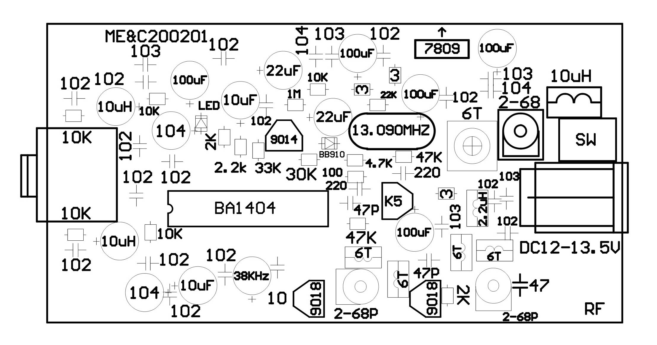 下图为该机电路板装配图。L1,L2,L6使用色标电感,L6应选择功率不小于1/8W的色标电感,其它电感线圈均使用直径为0.51mm的漆包线在3.3mm的钻头上绕制,圈数为图中所标。Q4亦可选用C2053可使射输出功率更大些。整板工作电流约为200毫安。直流电源应选择输出电流不小于500毫安输入电压为12V的直流适配器。如果工作电源的输出功率不够,极易引入交流声,影响发射机的工作性能。