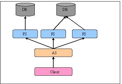 可以这么说,4层架构是一种“纵向”的架构,“类似地域分布式”则侧重于“横向”,在“类似地域分布式”体系结构中,每一个具体的“4层架构的实现”只是其中的一个组成元素。我举个例子,现在我们的一个应用需要为全国范围内的所有大城市的手机用户提供某种基于C/S的手机增值服务。我们的经验是,为每个城市配置一个应用服务器AS,由于大量的计算在该AS对应的FS上,所以可能需要多个FS为这个AS服务。而每个城市的AS之间可能需要相互通信(比如处理漫游用户),这就需要将AS也管理起来,管理AS的服务器是IRAS(跨区域服务器)。如此一来,我可以画出下图作为例子: