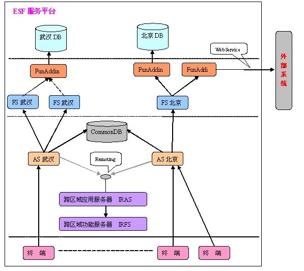 除了外部系统的接入通过分布式服务进行外,各应用服务器之间、功能服务器与应用服务器之间、应用服务器和跨区域的应用服务器之间都是采用分布式通信。跨区域的应用服务器通过类似于remoting的方式在各个应用服务器之间进行调度。
