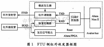 FTU侧的收发电路包括一个接收器和两个红外发射管,将红外收发器的信号ITXD和IRXD直接接到FPGA的两个I/O脚上即可,框图如图1所示。
