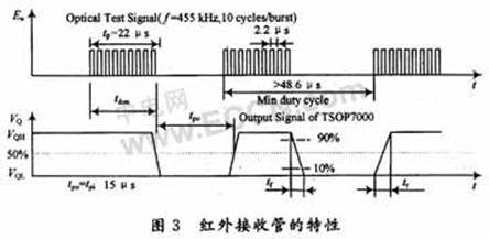 红外接收采用Vishay的高速接收管TSOP7000,如图3所示,可以工作在455 kHz,和870 nm的红外发射管TSHF5400配对使用时,在If=300 mA时传输距离可达20 m。