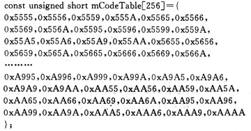 在这张表中,0被编码成0x5555,0xff编码成0xaaaa等。由于待编码的数据总是介于0~255之间,所以通过下面的查找表可以实现应用层编码。