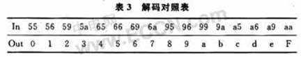 十六进制解码对照表如表3所示,如输入55,解码值为0,输入99解码值为a,对应其他输入解码输出为0x80即误码。