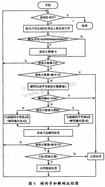 如根据接收计数器为8和9时获得目标地址字段,接收计数器为10和11时获得帧长的低字节,接收计数器为12和13时获得帧长的高字节,依次类推接收所有应用层数据,整个帧同步和解码过程如图4所示。