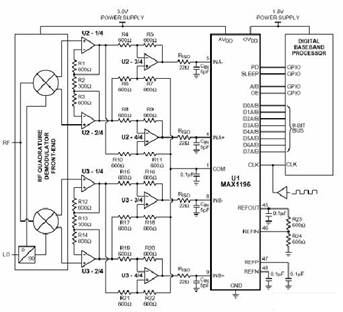 图1中,UI可以简化RF前端与驱动放大器、ADC之间的直流耦合、差分模拟接口。电路包括:两路8位、40Msps ADC (U1)和两片四通道、单电源供电的宽带放大器(U2-U3),能够适应RF正交解调器(差分、直流耦合信号源)与高速ADC之间较宽的共模电压范围要求。ADC提供足够的信号/噪声+失真比(SINAD)和无杂散动态范围(SFDR),用于解调3.84MHz宽带的QPSK通信链路。U2、U3应满足SFDR和输入共模电压范围的要求,3V单电源供电时,U1消耗90mW的功率。