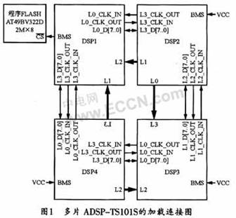 采用单片FLASH结合FS101S的链路口加载方式,可以实现多ADSP-TS101S系统的程序加载。该方式只需要一片较大容量的FLASH,而不需要辅助逻辑,便可实现多ADSP一TS101S系统的程序加载,而且多ADSP-TS101S之间可通过链路口相连,因而大大降低了系统的设计复杂度。