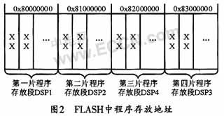 采用这种结构的多ADSP-TS101S系统,应将每片ADSP-TS10lS的程序分开放置在FLASH的不同的地址段中。第一片ADSP-TS101S的程序存放在FLASH的从0开始的第一段地址中。第二片ADSP-TS101S存放在接着第一段地址后面的第二段地址空间中,第三片ADSP-TS101S存放在接着第二段地址后面的第三段地址空间中……以此类推,就可将不同的ADSP-TS101S的程序放置在相应的地址空间中。但应该注意的是,每一片ADSP-TS101S程序存放的实际地址必须是16的倍数,因为ADSP-TS10lS的链路口每次必须传输4字(4*32 bits),而FLASH是8位的,所以每次将读取128位的程序代码,即16个FLASH的地址数据。图2所示是多ADSP-TS101S的程序在FLASH中的存放情况。