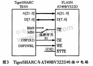 本设计中,FLASH选用的是Atmel公司的AT49BV322D,并将其设置成4 M×8模式,因此,其byte管脚需要拉低,具体和DSP之间的硬件接口电路如图3所示。