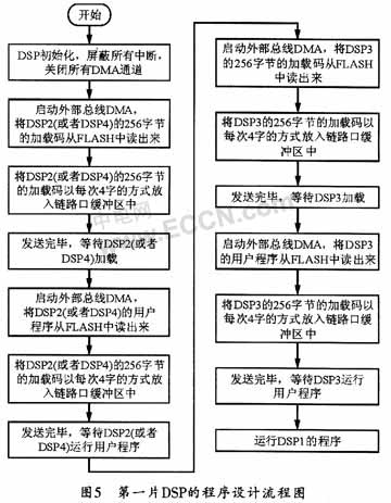 具体加载时,首先应由DSP1通过FLASH程序加载方式进行程序加载。即在DSP1程序加载完毕后,由DSP1再从FLASH中读出第二片,使DSP2(或者DSP4)的程序通过链路口。之后,再采用链路口加载方式加载DSP2(或者DSP4),DSP1在等待DSP2加载完毕后,又从FLASH中读取DSP3的程序,并将DSP3的程序通过链路口DMA方式发送到DSP2(或者DSP4)中,而DSP2(或者DSP4)在收到第三片DSP3的程序后,同样通过链路口加载方式加载DSP3;……以此类推,直到完成所有的ADSP-TS101S的加载。