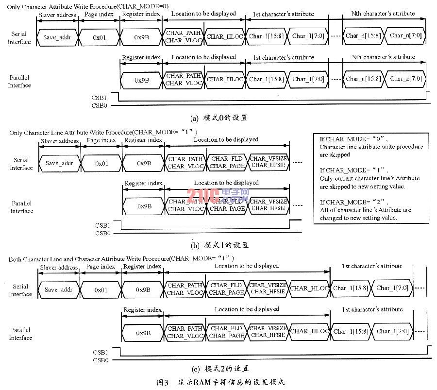设置显示RAM的字符信息有3种不同的模式,每种模式都可以通过串行接口或并行接口进行数据传输。显示RAM的设置模式可通过模式控制寄存器进行设置,设置模式有模式O、模式l和模式2三种,具体的设置模式如图3所示。