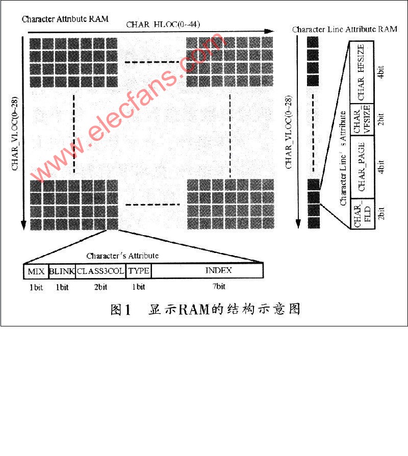 TW2834的字符叠加功能主要由字体RAM、显示RAM和叠加控制模块构成。图1所示是显示RAM的结构示意图。