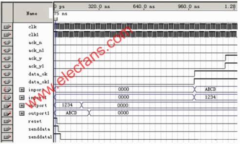 从跳转关系图也可以看出,当同时有握手帧和数据帧要发送时,是先发送握手帧的,这是因为握手帧比起数据帧来要短得多,所以先发送它能提高整体传输效率。数据链路层对该模块的操作是:把要发的数据帧发给ouport 端口,然后给senddata 一个跳变沿,此信号为开始发送信号。如果收到ack_y 握手信号,则发下一帧数据,如果接收到ack_n 握手信号,表示发送失败,则重发,如果在合理的时间内没接收到握手信号,则定义为超时,也重发,如果重发了三次还是失败,则用中断方式通知系统,通信失败。这样就能保证数控系统中数据传输的准确可靠。不会出现因某帧数据传输失败而导致比较严重的后果,比如工件的报废。