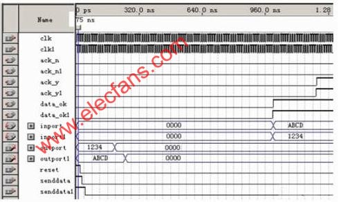 该仿真用的采样时钟是100M(用quartusII 综合出来后实际的采样时钟还可以更高),从结果可以看出:从senddata 跳变把outport 的数据锁存,并开始发送数据开始,到接收到握手信号的周期是1.15us,在这十六位数据中,低八位是地址,高八位才是有效数据,所以其有效位速率为6.95M,该有效速度完全能满足数控网络的要求。虽然这是仿真结果,但在实际数控系统中运行时的效果跟它是一样的,该光纤通信模块在实际系统中的调试已经结束。