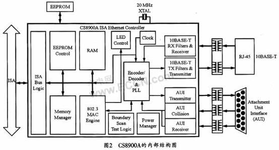 CS8900A是Cirus Logic公司生产的低功耗16位以太网控制器。它功能强大,其高度集成设计使其不再需要其它以太网控制器所必需的昂贵外部器件。CS8900A的内部结构如图2所示。