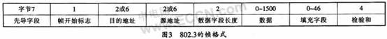CS8900A收到由主机发来的数据包(从目的地址域到数据域,如图3所示)后,即可侦听网络线路,如果线路忙,就等待,否则就立即发送该数据帧,图3所示是其802.3帧格式。