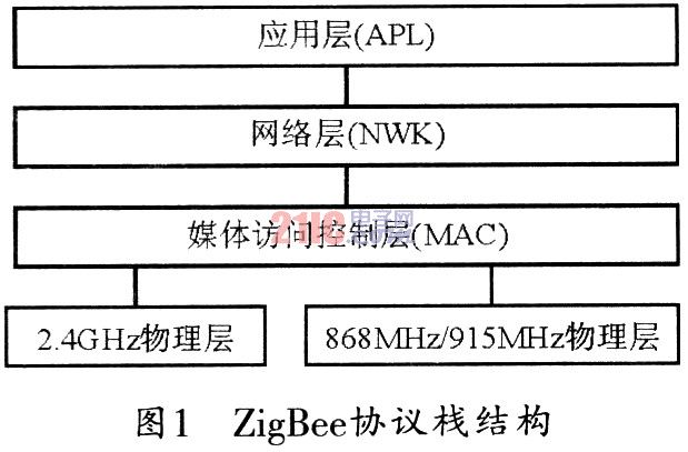 ZigBee是一种新兴的短距离、低速率无线网络技术,它是一种介于无线标记和蓝牙之间的无线技术方案。ZigBee的基础是IEEE 802. 15.4,它规定了ZigBee的物理层和媒体接人控制层。ZigBee的工作频段分别为868 MHz、915 MHz、2.4GHz三个频段,其中频段868 MHz定义了1个频道:频段915 MHz定义了 10个频道;频段2.4 GHz定义了16个频道。ZigBee技术采用CSMA-CA的信道接入方式,可有效避免通信的冲突。ZigBee网络层协议由ZigBee联盟制定,其设备可以构造成星型网络或点对点的网络,连接地址分为16位短地址和64位长地址。因而具有较大网络容量。它的应用层可根据用户的需要进行开发利用。其ZigBee协议栈结构如图l所示。