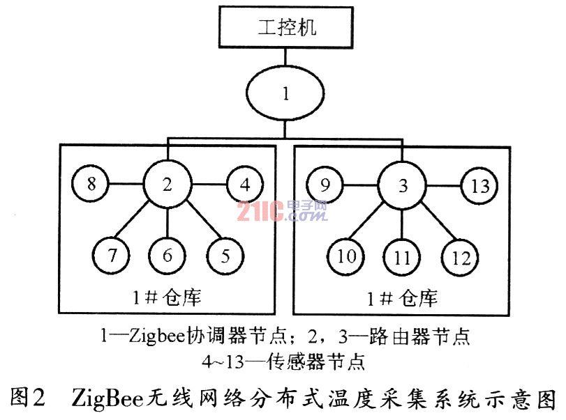 在粮库温控系统、冷库温控系统、智能化建筑控制系统、中央空调系统等众多应用系统中,都需要多点分布式温度测量系统。传统的多点分布式温度测量系统多采用有线传输方式,需要在现场进行大量布线,这给系统的布设、维护和更新升级带来诸多不便。本文设计的仓库温度监控系统采用ZigBee技术的无线通信网络来对仓库各点温度进行连续24 h的监控,从而使管理者可以在控制室随时了解仓库现场的温度信息。