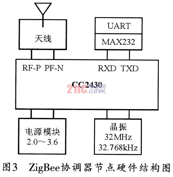 ZigBee协调器节点硬件设计如图3所示,该节点由无线收发器CC2430、射频天线RF、电源模块、晶振电路和串口电路组成。RF的输入/输出是高阻和差动的,用于RF口最合适的差动负载是(115+j180)Ω。当使用不平衡天线(例如单极天线)时,为了优化性能,应当使用不平衡变压器。不平衡变压器可以运行在使用低成本的单独电感器和电容器的场合。电源模块用于CC2430的数字I/O和部分模拟I/O的供电,供电电压为2.0~3.6 V。CC2430可以同时接32 MHz和32.768kHz的两种频率的晶振电路,以满足不同的要求。串口电路用于CC2430将接收到的数据传送给上位工控机,由于上位工控机与CC2430的电平不一致,所以需要一个MAX232电平转换电路。