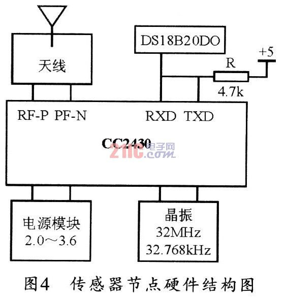传感器节点和硬件设计如图4所示,该节点由无线收发器CC2430、射频天线RF、电源模块、晶振电路和串口电路组成。电路中DSl8820与