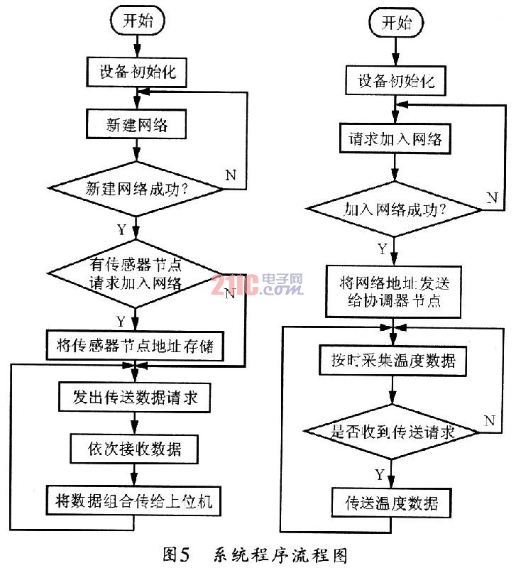 本系统所用的开发环境是IAR7,采用的协议栈为TI的Z-STACK。由于本系统采用树形结构,所以,ZigBee协调器必须知道每个传感器节点的网络地址,这就需要每个传感器在加入网络后,都要把网络地址发送给协调器,协调器收到传感器的网络地址后,便可建立地址表并存储起来,以便用户要求采集温度数据时,依据地址表来采集每个传感器的数据。图5所示是其程序流程图,图中的左边是协调器节点的软件设计程序流程图,右边是传感器节点的软件设计程序流程图。