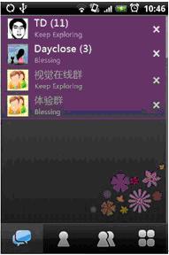 在此版本中,未读消息和已读消息用数字和文字颜色的灰度值来区分,新消息会在消息盒子里轻松显示条数,默认的紫色背景提供了最柔和的视觉效果。如果想要关掉与某个好友或群的会话,点击所在行后面的"×"按钮,就可以轻松搞定了。当你在使用手机其他功能的时候,新消息会在手机的状态栏滚动提示。