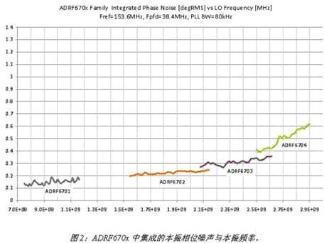 ADRF670x和ADRF660x系列小数N分频PLL设计是低相位噪声的3G和4G应用的理想之选。这些新的蜂窝标准具有密集的信号星座,要求越来越低的本振相位噪声以获得足够的性能。传统的PLL合成器设计使用“整数N”架构,其输出频率是鉴相器频率的整数倍。为提供较小的频率步进,整数倍增因子必须非常大。大量本振相位噪声源于参考路径,并被PLL频率倍增因子所放大,这将导致PLL输出端产生很高的带内噪声。小数N分频PLL允许输出频率有较小的步进,同时保持低的总倍频值,因而与整数N分频PLL相比,可以降低相位噪声放大值。