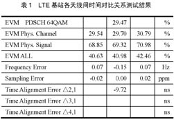 对于LTE的发射机测试,与传统模式测试最大的不同在于其需要支持MIMO技术,与其相关的上述测试项就有不同天线间的时间对比关系测试项;其原理即为测试两个或多个天线间,在正常工作的状态下,其各自发射信号间的时间误差。使用R&S的矢量信号分析仪FSQ (或FSV) ,一台仪表就可以实现该项测试(测试结果参见表1);不仅如此,还可以测试每个天线各自的信号质量等。测试时,只需把基站的两个天线通过合路器链接到FSQ的射频口,通过FSQ内部的功能键选择得到相应的测试结果。