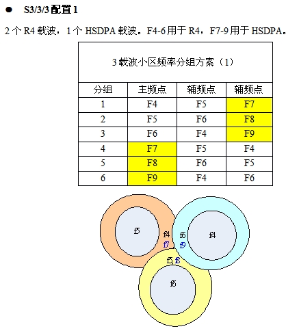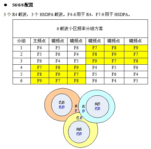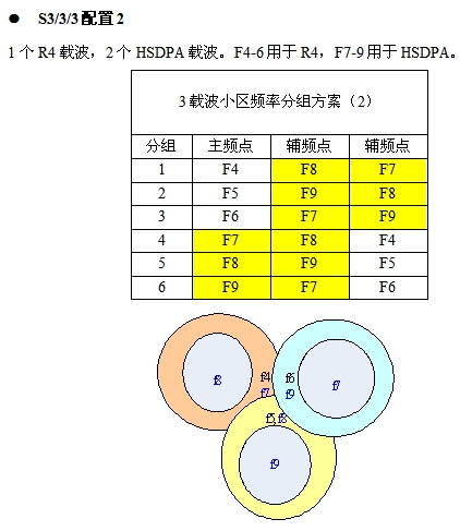 这种配置方案的特点是主载波频率复用分子为6,保证主载波的质量;R4和HSDPA载波分开,避免互相干扰;HSDPA载波频率复用因子3,边缘速率有保证;R4软复用。