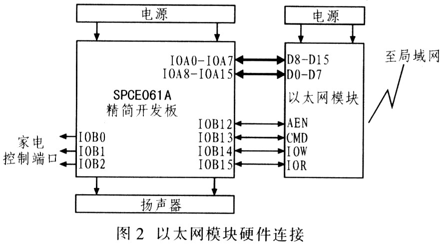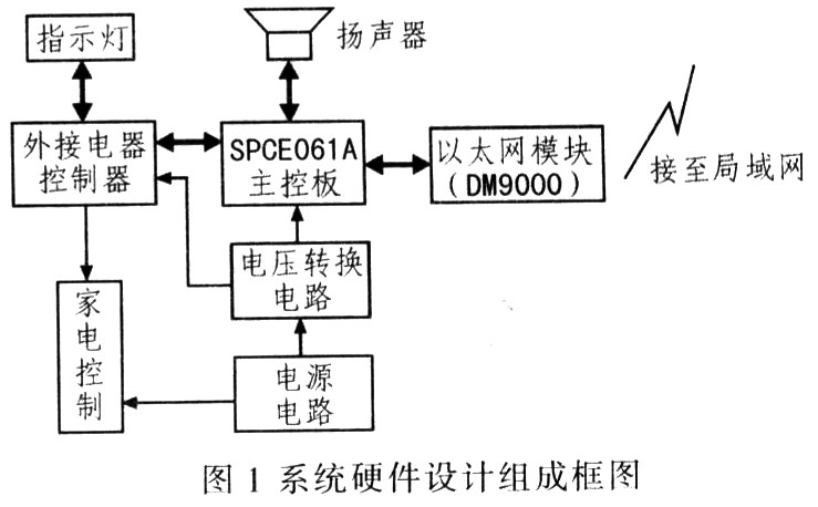图l为该系统硬件设计组成框图,主要由SPCE061A主控板、DM9000控制模块、电源电路、外接电器控制电路、扬声器组成。其中,DM9000以太网控制模块通过16位单片机SPCE061A直接控制,完成相应数据包的收发和解析,解析完成后,再由SPCE06iA向外接电器控制电路、扬声器以及指示灯模块发出操作指令,进而控制家电。