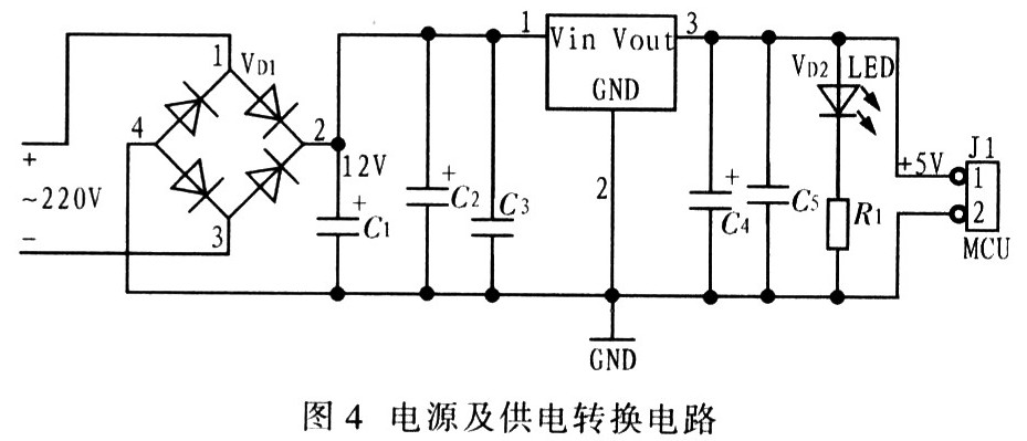 图4中,变压器的选择要合适,三端集成稳压器要做好散热设备,以免烧坏,导致整个设备无法正常工作。