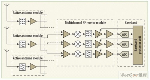 图2:带数字IF级和多个有源天线模块的TD-SCDMA RF接收机结构框图。