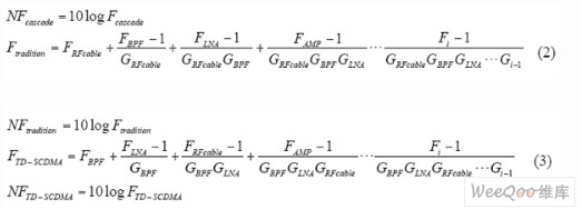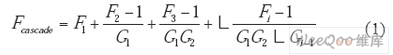 当接收机由多个块组成时,每个块都有自己的插入增益(Gi)和噪声因数(Fi)。每个块都会增加噪声到信号中,但当信号在前级电路中被放大时,后续块对总噪声因数的影响会减弱。接收机的噪声系数可以用式1计算。式1中的值必须用增益和噪声因数(F)的数值计算,而不能作为对数式噪声系数值(单位dB)。这个简单级联的噪声系数公式的含义在系统设计中是很重要的。