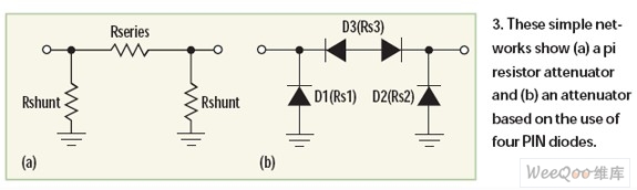 图3:(a)典型的π型电阻衰减器;(b)采用PIN二极管的衰减器。