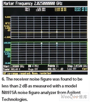 图5(a)和5(b)分别是有源天线模块和多通道射频接收机模块。这种多通道射频接收机模块被集成在尺寸为150x200x20mm的四层电路板上。图6给出了用安捷伦科技公司的N8975A噪声系数分析仪测得的总体接收机噪声系数和同样是安捷伦科技公司的E4438C信号发生器和89600软件测得的调制性能。如图6所示,接收机噪声系数小于2dB,而系统测得的基准灵敏度为-115dBm。图7给出了误差向量幅度(EVM)性能。