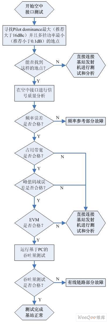 基于方便合理的原则,应首先使用空中接口测量方式在合适的地点检查基站发射机的信号覆盖和信号质量,争取在空口测试中对基站状态做出准确判断。如难以判断空口测量结果或需要精确测量发射功率,则需要直接连接基站进行测试。测试步骤如图2所示。
