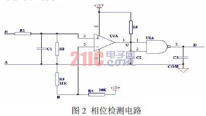 本系统所设计的相位检测电路,即是在正弦交流电固定的相位点,使相位检测电路产 生具有一定占空比的方波信号,由此方波给P89LPC932 提供50Hz 的外部中断信号,相位 检测电路硬件原理图如图2 所示: