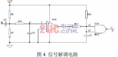 信号解调电路的功能主要是把低压电力线上调制的信号从电力线上解调出来,发送给P89LPC932,供微控制器进行相应的处理。其硬件原理图如图4 所示: