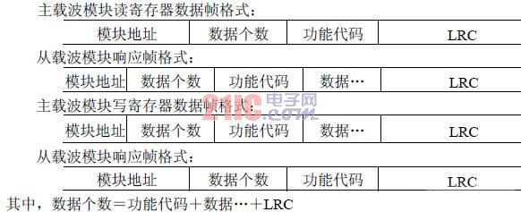 软件设计的一个重点是低压电力线智能载波模块通讯协议的制定。在本设计中,采用 改进的Modbus协议。其是由Modbus协议的ASCII传输模式和RTU传输模式融合改进而来。 此协议实现主载波模块对从载波模块的读和写操作。其帧格式分别如下: