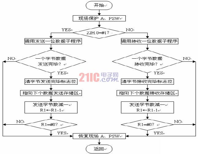 载波数据的发送和接收是在在微控制器P89LPC932外部中断子程序中实现的。其程序流程图如5所示: