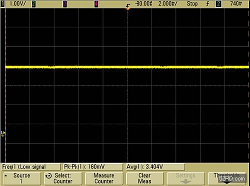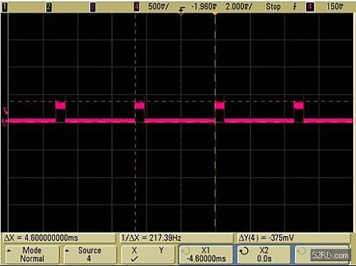 在附近存在RF干扰的情况下,即在测试点附近(5米以内)用手机打电话,来测试SN74AVCA16425GR的引脚37上的信号。图3显示当设备不加电时(I/O状态未知),其输出反常;而图4则显示当设备加电(输入状态)时其输出的反常情况。