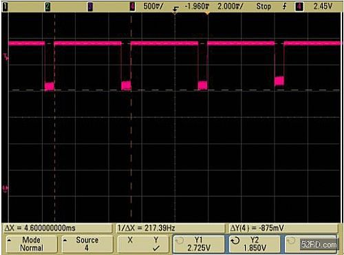 图1显示当射频功率放大器接通时,进入AD6903的GPIO_1引脚上的UARTRX信号受到影响的情况。在图1中,进入AD6903的UARTRX用粉红色表示,来自主处理机的UARTTX信号用紫色表示,功率放大器使能用黄色表示,而AD6903VEXT电源用绿色表示。