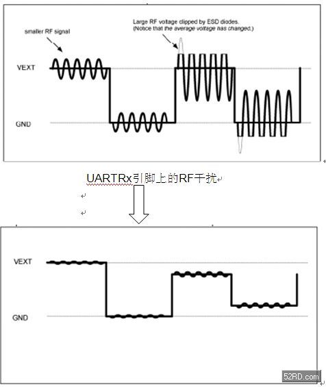 进入AD6903的UARTRX信号的这种“RF干扰拾取”行为的发生以一个特定的RF频率为中心,而这些信号迹线没有完全被屏蔽。这种现象是可以解释的:主板的印刷导线拾取干扰,因为导线上有寄生电感、寄生电阻和寄生电容,而导线的两端连接的是高阻抗;一侧是一个10kΩ电阻器,另一侧则是CMOS输入。电路板上的导线就像一个具有1/4波长响应的天线。