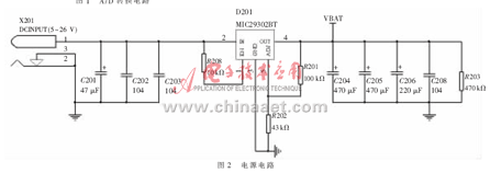 SIM300C模块的1、3、5、7、9脚为电源输入引脚VBAT,2、4、6、8、10脚是地。由于模块的供电电压为3.4~4.5 V(典型值为4.2 V),采用 5 V供电时,需要进行5 V到4.2 V的电压转换。设计中使用MICREL公司的MIC29300系列芯片为SIM300C提供4.2 V的电压,其输出电流可达到3 A,能够满足SIM300C的要求。电源电路如图2所示。