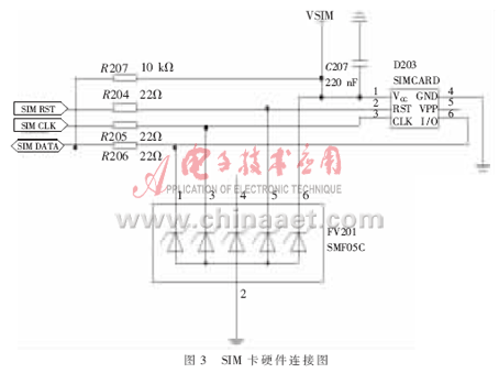 SIM300C模块提供的SIM卡接口信号有:VSIM-SIM卡电源、SIMRST-复位、SIMCLK-时钟、SIMDATA-数据。SIM卡与模块之间通过SIM卡座进行连接,设计中采用6针SIM卡座,其信号线主要有:电源(VCC)、地(GND)、复位(RST)、状态(VPP)、时钟(CLK)、数据(I/O),其中状态线VPP不接。SIM卡电源可以是1.8 V或3 V,RST、CLK、I/O 3个引脚分别连接22 ?赘电阻后,再与SIM300C的SIMRST、SIMCLK、SIMDATA相连,SIMDATA与VSIM间还需接1个10 k?赘的上拉电阻。另外,在SIM卡接口电路中,为了减小静电干扰,应使用静电防护器件,设计中采用了SEMI公司的SMF05C[8]。其硬件连接如图3所示。